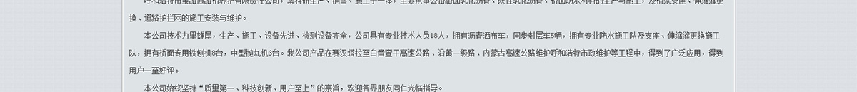 呼和浩特市寶路通路橋養(yǎng)護(hù)有限責(zé)任公司,集科研生產(chǎn)、銷售、施工于一體,主要從事公路路面乳化瀝青、改性乳化瀝青、橋面防水材料的生產(chǎn)與施工,及橋梁支座、伸縮縫更換、道路護(hù)攔網(wǎng)的施工安裝與維護(hù)。