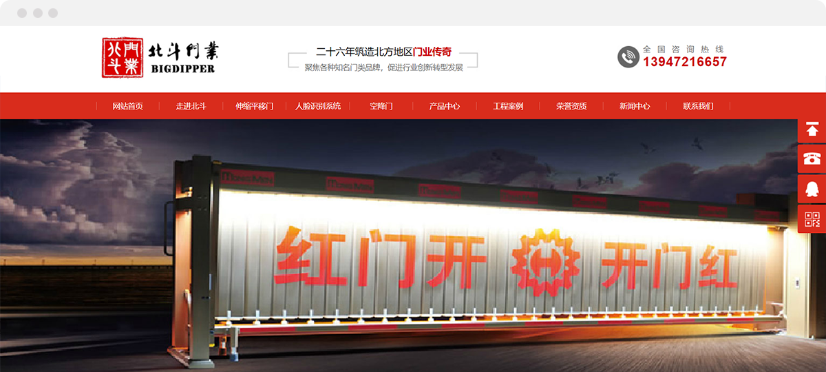 呼和浩特網(wǎng)絡公司此次承接呼和浩特市北斗門業(yè)有限責任公司網(wǎng)站建設及網(wǎng)站維護,呼和浩特市北斗門業(yè)有限責任公司成立于1992年。成立之初,即自行設計、研發(fā)、加工、生產(chǎn)北斗牌自動伸縮門。在當時,北斗自動門可以說是包頭市乃整個北方地區(qū)的產(chǎn)品,所以,全力于產(chǎn)品質量的、技術改進以及更新?lián)Q代一直是北斗的經(jīng)營。于是就有了多項專利發(fā)明,就有了不銹鋼標準門、花管門、M門、沙漠等拳頭產(chǎn)品;于是就有了內蒙地區(qū)90%以上的市場占有率;就有了伸縮門制造商紅門公司與北斗的合作;于是就有了北斗銷售網(wǎng)絡的不斷擴大。到今天,北京、天津、銀川、呼和浩特、包頭、鄂爾多斯、巴彥淖爾、二連浩特,錫林郭勒等地均有北斗的加盟公司和銷售網(wǎng)點。我們的產(chǎn)品也已由當年單一的伸縮門擴展到車庫門、各類工業(yè)門、智能管理系統(tǒng)等系列。