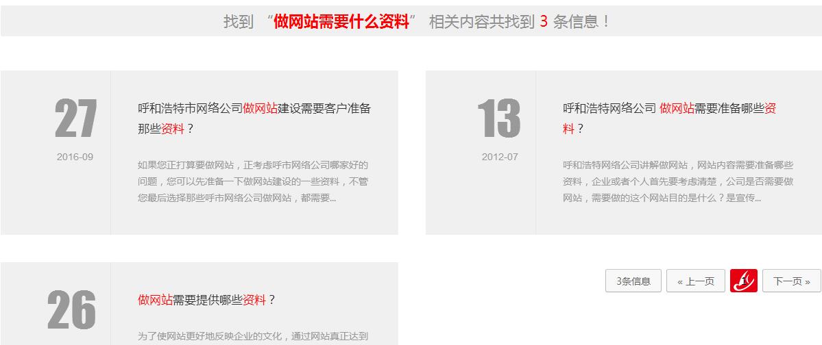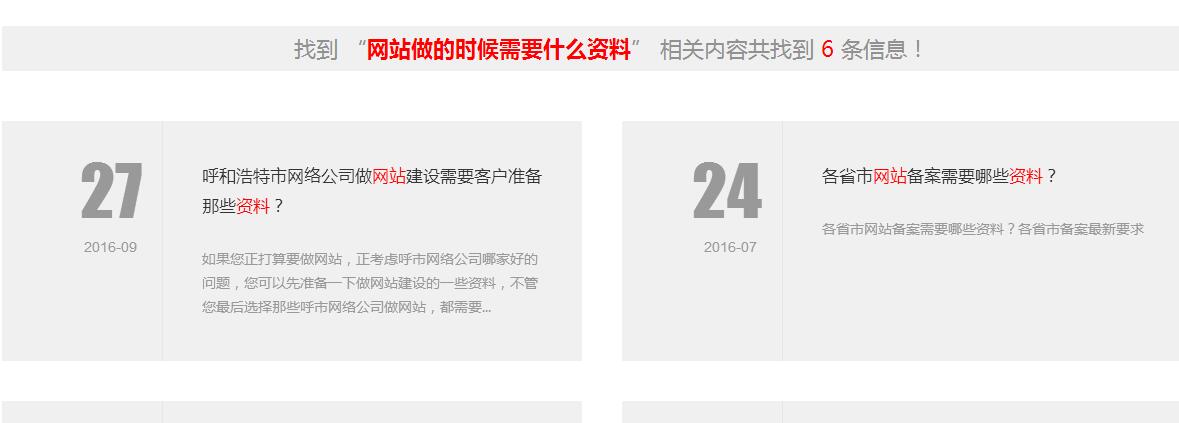 用標(biāo)題或內(nèi)容過濾 搜索 “”做網(wǎng)站需要什么資料“”是沒有內(nèi)容的,實際上我們已經(jīng)添加了幾篇相關(guān)內(nèi)容,但是用這種方式是搜索不出來的。除非標(biāo)題或內(nèi)容里面含有“”做網(wǎng)站需要什么資料“”這句話。