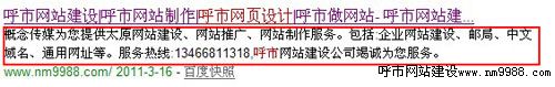網(wǎng)站描述標(biāo)簽是對(duì)網(wǎng)站整體概況描述的一段話,這段話不要寫的太長不要超過100多個(gè)字,這段話中要寫上公司業(yè)務(wù)和 公司名字及聯(lián)系方式,這段基本上是在搜索結(jié)果顯示的如圖: