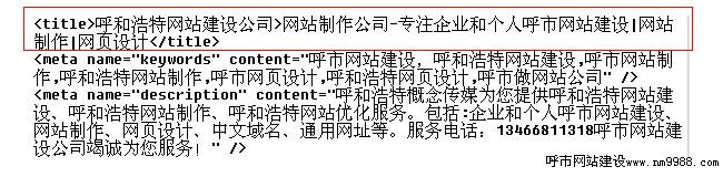 標(biāo)題標(biāo)簽title在網(wǎng)站建設(shè)中設(shè)置不要超過17個(gè)文字。把網(wǎng)站優(yōu)化的關(guān)鍵詞和公司名字編輯成一句通順的話,可以加“_ >”符號,這里可以加上電話號碼,在代碼之間設(shè)置如圖所示: