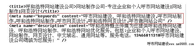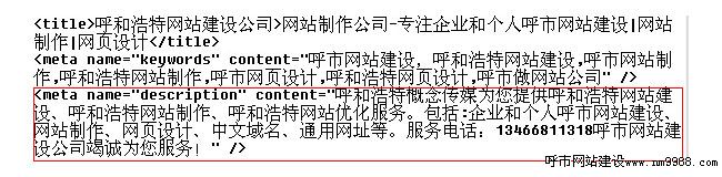 在網(wǎng)站建設(shè),網(wǎng)站制作中設(shè)置網(wǎng)站描述標(biāo)簽不要超過70個(gè)文字,把關(guān)鍵詞和公司名字編輯成一段話,要通順簡要,標(biāo)題里沒加公司電話號碼,這里就加上,寫描述的時(shí)候,可以把關(guān)鍵詞修飾一下,這里一定要寫的吸引客戶,讓客戶看了就有點(diǎn)擊的欲望!在網(wǎng)站代碼中設(shè)置如圖: