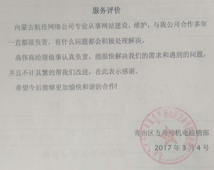 發(fā)布時(shí)間:2017-03-09關(guān)注:9648編輯:內(nèi)蒙古航佳網(wǎng)絡(luò)科技有限公司標(biāo)簽: 網(wǎng)站建設(shè)公司 客戶評(píng)價(jià)