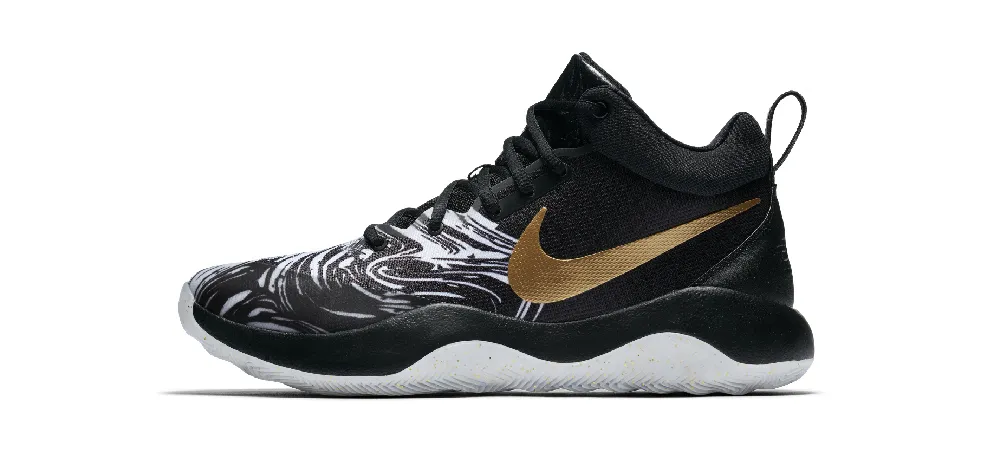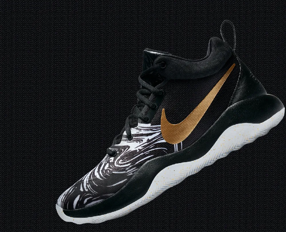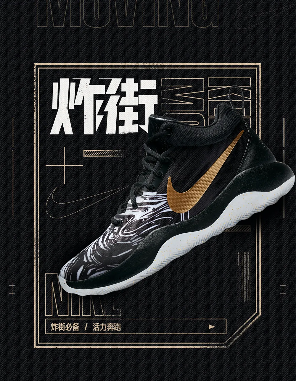 接下來,我們給鞋子添加陰影,并用筆刷簡單刷一點(diǎn)噪點(diǎn),整個(gè)畫面我使用了黑金色進(jìn)行設(shè)計(jì),顏色本身是從鞋子當(dāng)中提取到的,黑金給人的感受也是更酷一點(diǎn)。