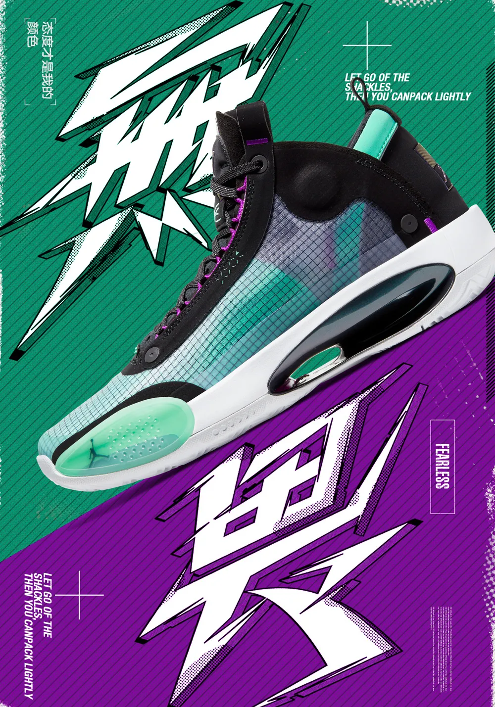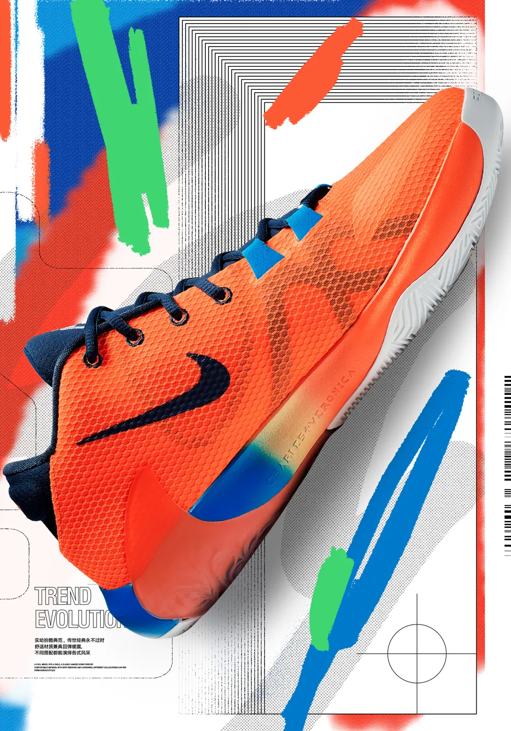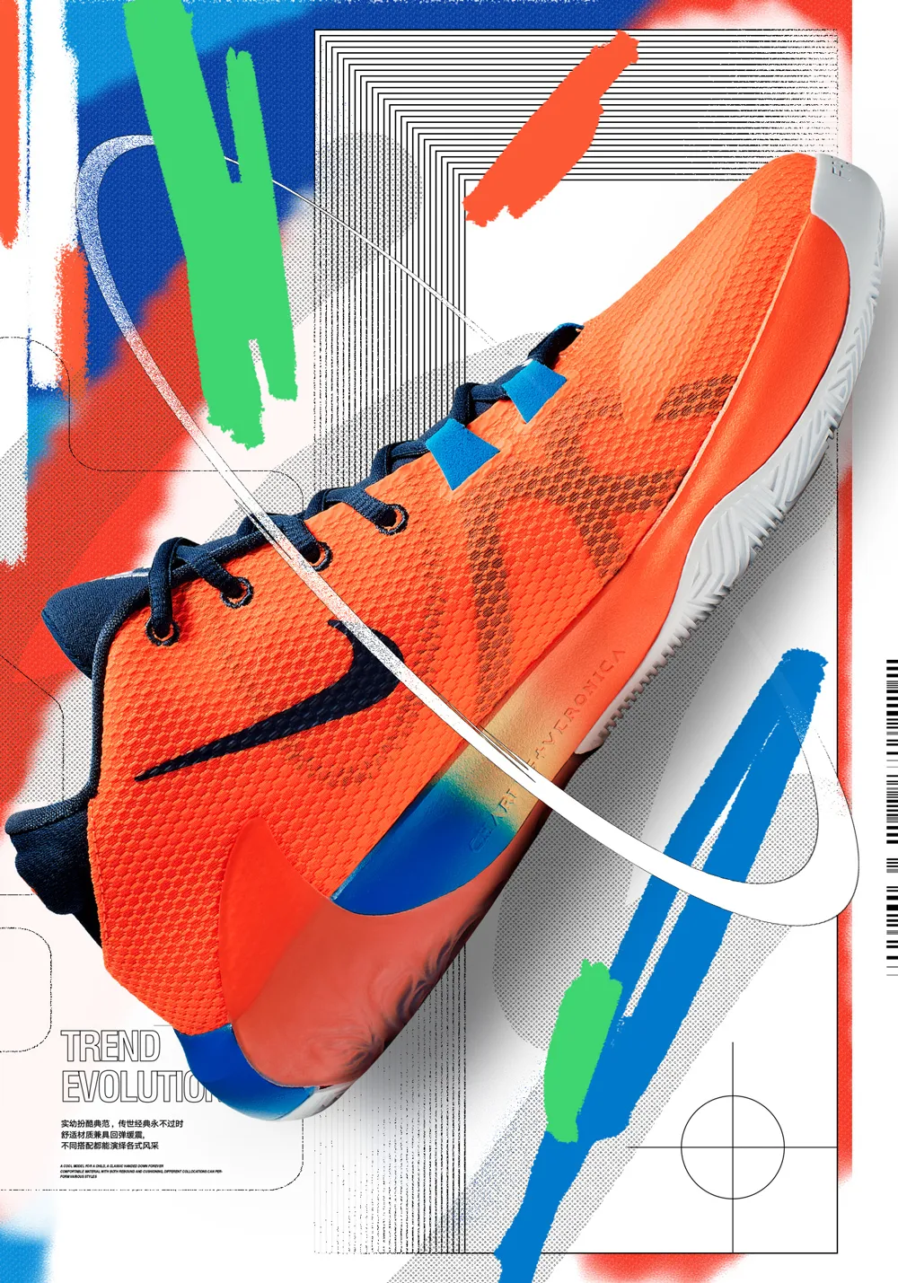 后我們來看一下整體的組合效果,因?yàn)檫@里的顏色是傾斜切分的,所以很自然的就將鞋子傾斜放置到了顏色切分的位置。