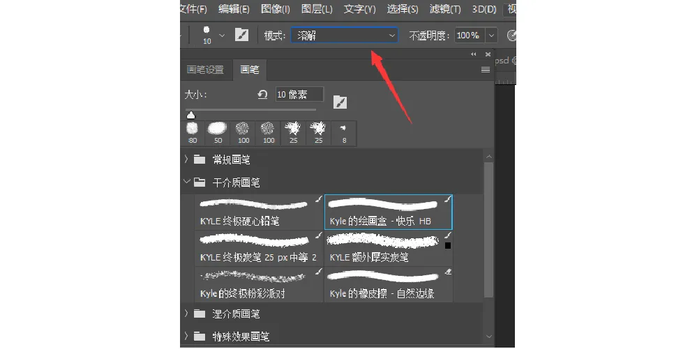 我用到的主要是干介質(zhì)畫筆和特殊效果畫筆。先說干介質(zhì)畫筆如何用。