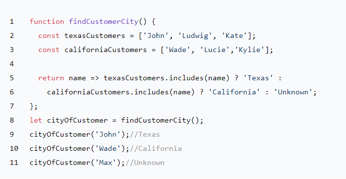 在上面的示例中,借助于閉包,返回到變量 cityOfCustomer 的內(nèi)部函數(shù)可以訪問外部函數(shù) findCustomerCity() 的常量。而且,每當(dāng)以傳遞的名稱作為參數(shù)調(diào)用內(nèi)部函數(shù)時(shí),都無需再次實(shí)例化常量。要了解關(guān)于閉包的更多信息,建議你閱讀 Prashant 的博客文章。