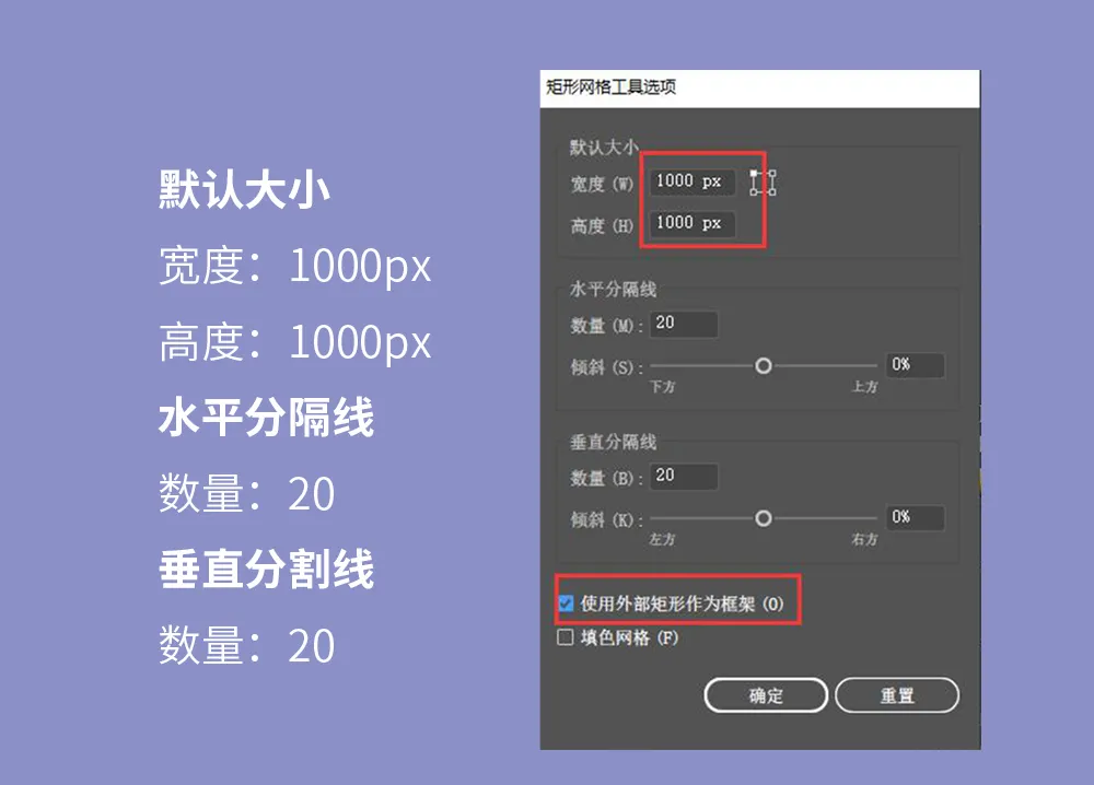 將鼠標光標移動到畫布并單擊鼠標,會彈出一個彈窗:「默認大小」1000px*1000px,「水平分隔線」數(shù)量:20,「垂直分隔線」數(shù)量:20,并勾選個選項。(網(wǎng)格數(shù)千萬不要貪心建多了,不然玩久了眼睛真的很疼)